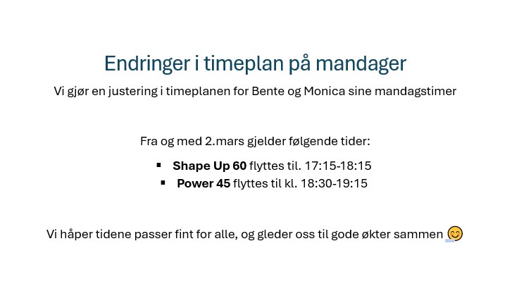Vi gjør en justering i timeplanen for Bente og Monica sine mandagstimer