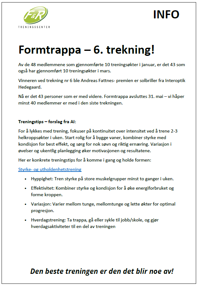 Nå er det 43 personer som er med videre. Formtrappa avsluttes 31. mai – vi håper minst 40 medlemmer er med i den siste trekningen.