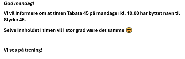 Vi vil informere om at timen Tabata 45 på mandager kl. 10.00 har byttet navn til Styrke 45.